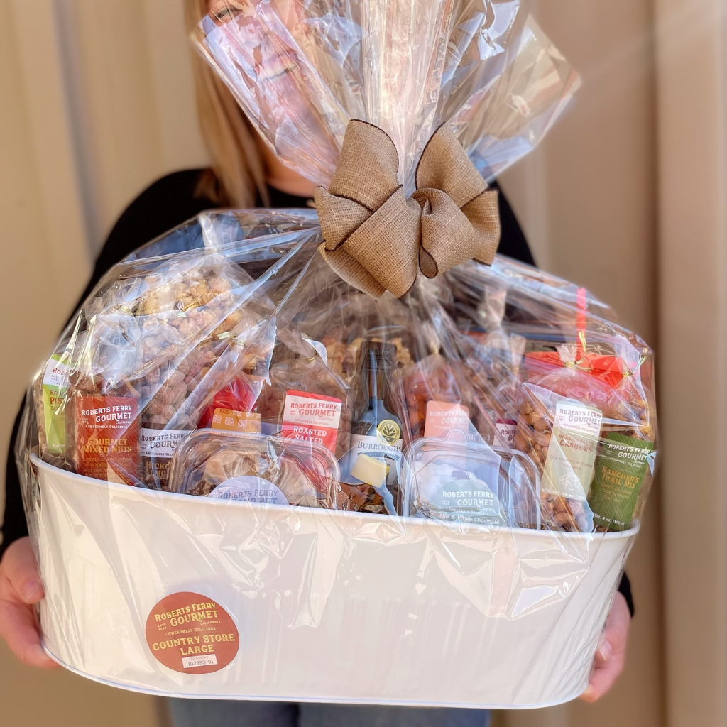 Perfect for VIPs and group gifting, these plentiful gift baskets bring our Country Store to wherever you are! Available in two sizes, medium and large, the large Country Store Gift Basket features 16 items, including Almond Brittle, Almond Caramel Popcorn, Cranberry Almond Caramel Popcorn, Cinnamon Bears, Macadamia Pecan Almond Caramel Popcorn, Dried Apricots, Dusted Chocolate Toffee Almonds, Gourmet Mixed Nuts, Greek Yogurt Raisins, Hickory Almonds, Chocolate Almond Clusters, Rancher's Mix, Locally Sourced Olive Oil, Roasted Salted Cashews, Roasted Salted Pistachios, Roasted Salted Almonds, and a Roberts Ferry Gourmet Tumbler.