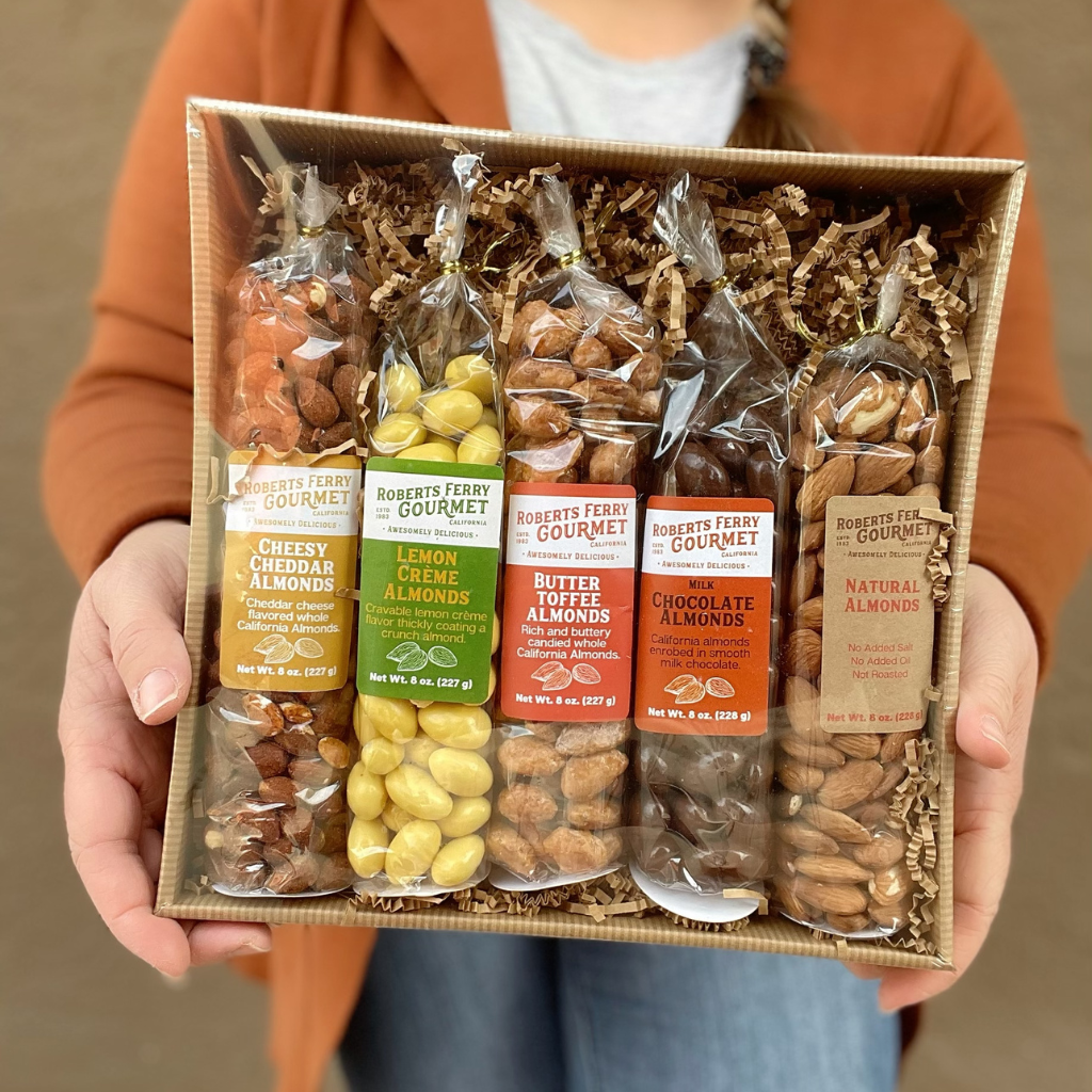 Almond lovers, get ready for awesome! We use only locally-sourced California almonds, known for their exceptional flavor. Satisfy your almond cravings with this delicious selection. Features Cheesy Cheddar, Butter Toffee, Lemon Crème, Whole Natural, and Milk Chocolate Almonds, all tastefully presented in our stylish gift box.