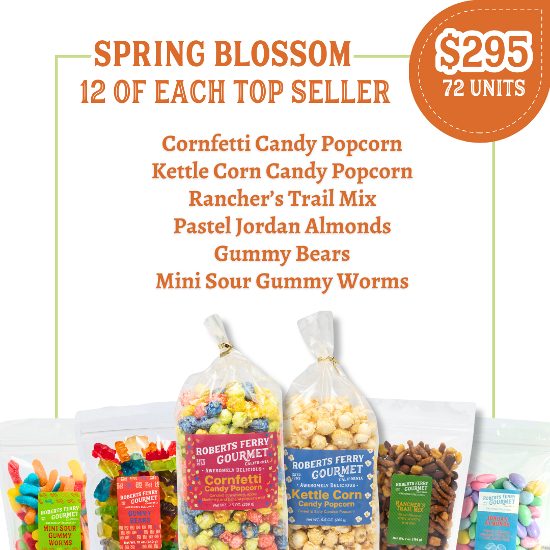 The Spring Blossom Bundle captures the essence of spring with its colorful and lively selection. This bundle includes 12 units each of Cornfetti Candied Popcorn, Kettle Corn, Rancher's Trail Mix, Jordan Almonds, Gummy Bears, and Mini Sour Gummy Worms, totaling 72 units in thier most popular sizes.