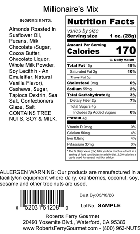 Indulge yourself in our Millionaire's Mix - a bounty of whole roasted Califonia almonds, huge pecan halves, and scrumptious chocolate cashews enhanced with a pinch of sea salt. The perfect blend of crunch, savoriness, natural goodness, and sweetness - why not treat yourself? Try it now!