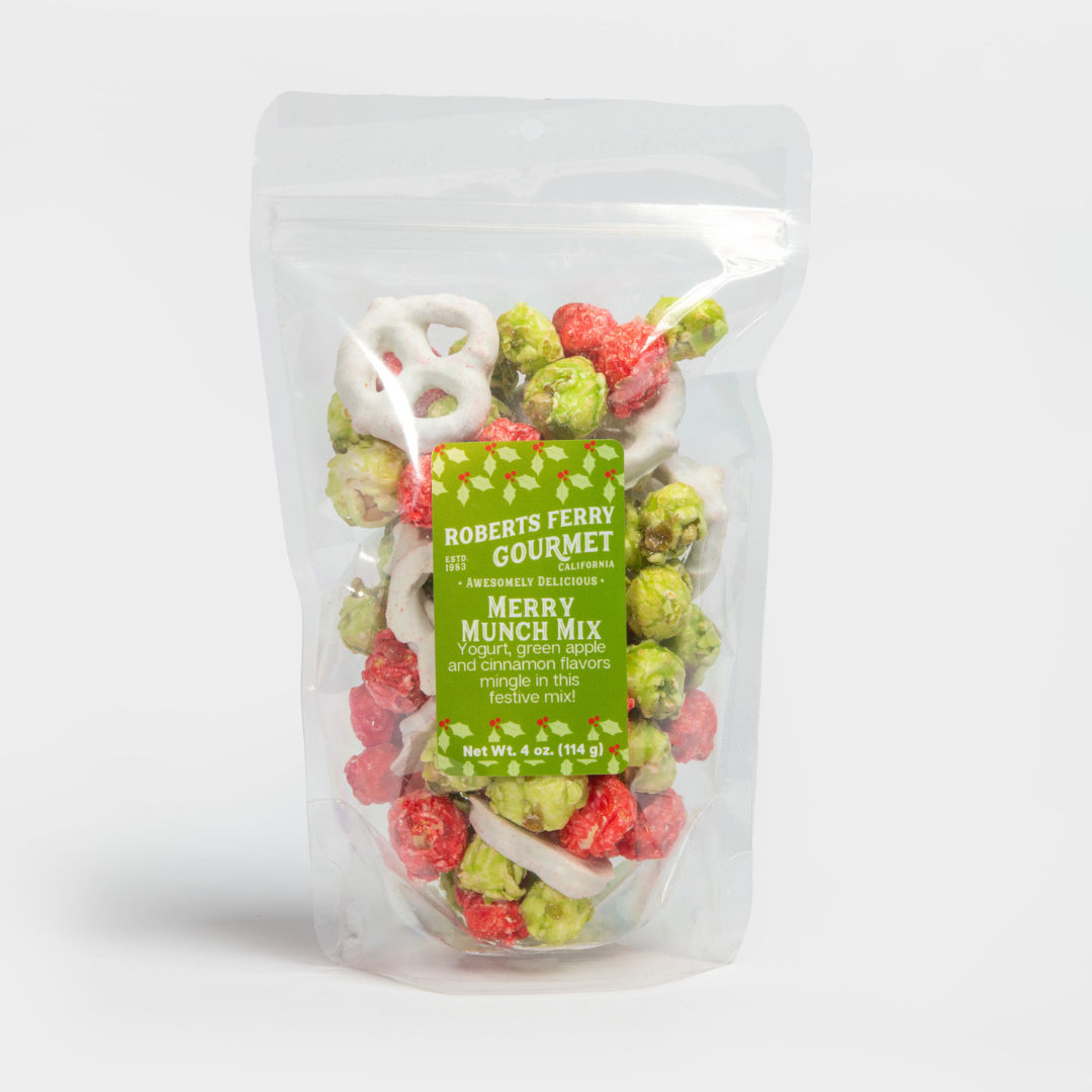 Get ready to munch on some holiday cheer with our Merry Munch Mix! Our blend of Yogurt Pretzels, Cinnamon Candy Popcorn, and Green Apple Popcorn will make any gathering merry and bright. So gather 'round and enjoy the festive flavors!